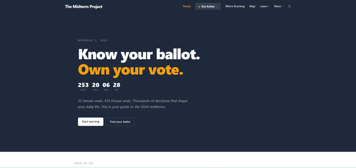 A voter resource hub helping everyday people find elections, check registration, and understand what's on the ballot.